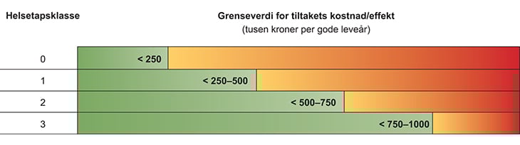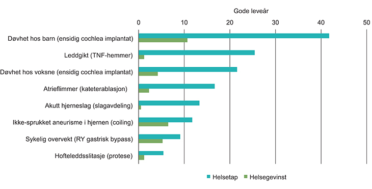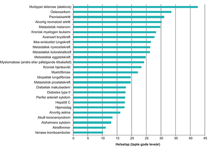 En illustrasjon av helsetapet, knyttet til et utvalg tilstander, er vist i figur 10.1. Helsetapet er her beregnet med utgangspunkt i data fra National Institute for Health and Care Excellence (NICE) i Storbritannia (NICE 2014b). Konkret gjelder det data for målgruppens gjennomsnittlige alder og gjennomsnittlige gjenværende kvalitetsjusterte leveår (QALYs) uten det aktuelle tiltaket (på det tidspunkt tiltaket er aktuelt). Alder ble omregnet til tidligere gode leveår ved hjelp av data for Norge fra det globale sykdomsbyrdeprosjektet. Helsetapet ble så beregnet ved å finne differansen mellom 80 og totalen av gode leveår i fortid og fremtid. Det er viktig å være oppmerksom på at helsetapet i tabellen viser summen av helsetapet som de med tilstanden har som del av gjennomsnittsbefolkningen og det ekstra helsetapet de har på grunn av akkurat den tilstanden.