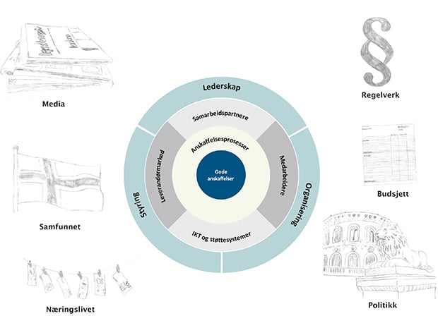 Modellen illustrerer blant annet at forståelsen og anvendelsen av anskaffelsesregelverket kun er en liten brikke i et helhetsbilde som samlet bidrar til en vellykket «offentlig anskaffelsesvirksomhet».