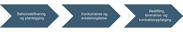 Anskaffelsesprosessen deles gjerne inn i tre hovedfaser, som alle må gjennomføres for å oppnå det gode innkjøp. Utvalget vil påpeke viktigheten av at disse fasene ses i sammenheng.