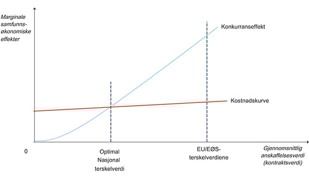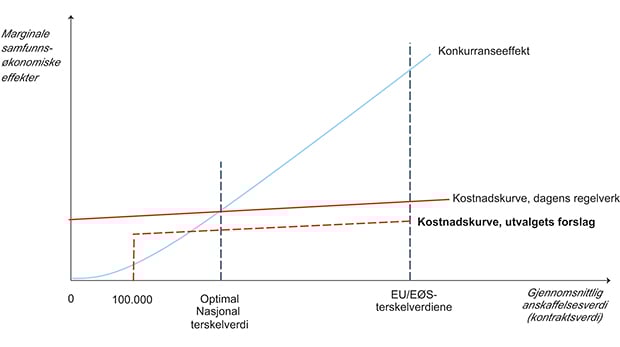 Utvalget har tatt utgangspunkt i samfunnsøkonomiske kost/nytte betraktninger i vurdering av dagens regelverk. Typisk er de samfunnsøkonomiske gevinstene i form av mer effektiv ressursutnyttelse ved økt konkurranse og mindre korrupsjon blitt drøftet opp mot de samfunnsøkonomiske kostnadene ved anvendelse av anskaffelsesregelverket. Det er vurdert om regelverket sikrer effektiv offentlig ressursbruk gjennom effektiv konkurranse, om dette gir likebehandling og forutberegnelighet for markedsaktørene, om regelverket er med på å forhindre korrupsjon og at allmennheten har tillit til at offentlige anskaffelser skjer på en samfunnstjenlig måte. Det er også vurdert hvordan regelverket virker i dag både over og under nasjonale terskelverdier.