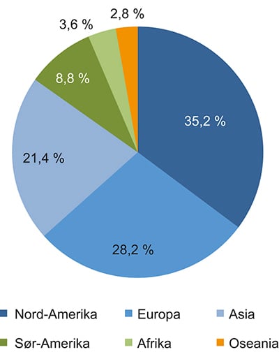 Data fra Coursera viser at kursdeltakerne kommer fra hele verden, men at majoriteten befinner seg i Nord-Amerika, Europa og Asia, jf. figur 7.2. Tilsvarende data fra edX og Canvas understøtter i stor grad dette bildet.