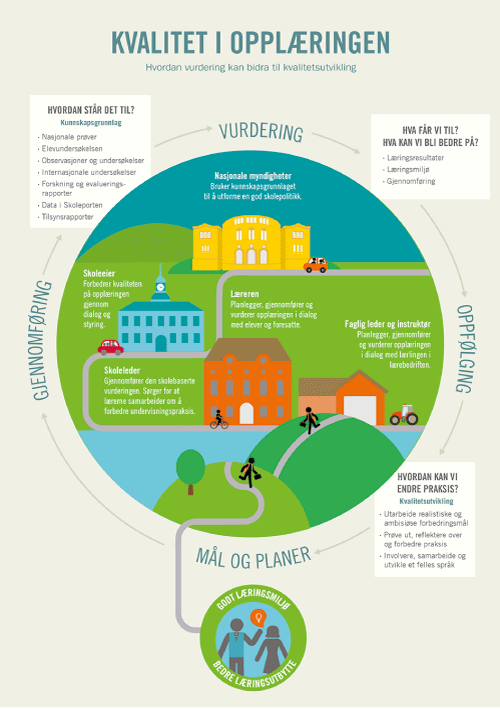 I norsk utdanningssystem forstås begrepet kvalitetsvurdering som det å sammenstille informasjon og data for å vurdere tilstanden internt på en skole, eller for å vurdere tilstanden i større deler av eller i hele utdanningssektoren.40 Formålet med kvalitetsvurdering er å videreutvikle kvaliteten på opplæringen og fremme elevenes læring og læringsmiljø.