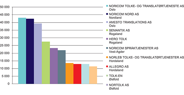 Den totale omsetningen for de enhetene som har levert regnskap var på nesten 500 millioner kroner i 2012.15 Figur 11.1 viser de 10 største formidlere av tolketjenester rangert etter omsetningstall. I denne oversikten er det forsøkt å skille ut de firmaene som hovedsakelig leverer tolketjenester.