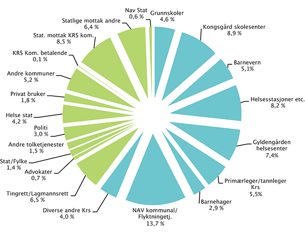 Figur 11.3 viser fordelingen av oppdragene i ulike sektorer ved den kommunale tolketjenesten i Kristiansand.