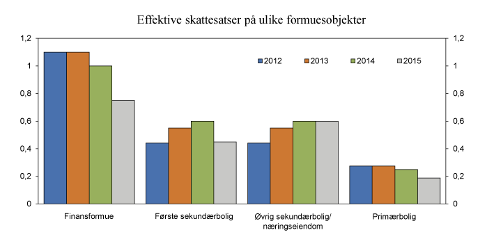 Figur 3.1 viser effektiv formuesskattesats for utvalgte formuesobjekter i 2012 – 2014 og med de foreslåtte endringene for 2015. Den effektive skattesatsen er den nominelle satsen redusert med eventuell verdsettingsrabatt. De formuesobjektene som i dag verdsettes til full verdi, dvs. finansformue og aksjer, vil få en entydig reduksjon i effektiv formuesskattesats med 25 pst. fra 2014 til 2015. Den effektive formuesskattesatsen på primærboliger vil også reduseres med 25 pst., fra 0,25 pst. til 0,19 pst. Sekundærbolig og næringseiendom har i dag en effektiv formuesskattesats på 0,6 pst. Med de foreslåtte endringene for 2015 reduseres den effektive formuesskattesatsen på den først anskaffede sekundærboligen med 25 pst., til 0,45 pst. Den effektive formuesskattesatsen på øvrig sekundærbolig og næringseiendom holdes uendret på 0,6 pst.