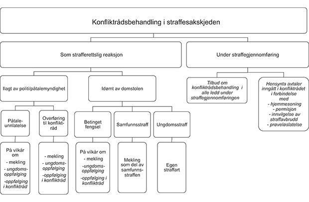 Figuren nedenfor viser oversikt over mulighetene til konfliktrådsbehandling i straffesakskjeden. Proposisjonens forslag er uthevet.