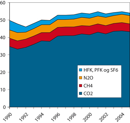 De samlede klimagassutslippene i perioden 1990 – 2005 er i de nyeste beregningene redusert med gjennomsnittlig 0,1 prosent per år i forhold til tidligere, jf. fig. 9.4. Det gir i praksis helt marginale endringer i forhold til oppfyllelsen av forpliktelsen i Kyoto-protokollen. Den viktigste endringen gjelder metan fra avfallsdeponigass, som i hele perioden nå er 7 – 10 prosent lavere enn tidligere beregnet. Også forbrenningsutslippene av metan fra oljeraffinerier er noe lavere enn før. For 2003 og 2004 er dessuten utslippene fra kysttrafikk redusert pga. reviderte tall for drivstoffbruk. Disse reduksjonene motvirkes noe av at noen utslipp innen trefordeling og oljeraffinering som ikke tidligere ble beregnet nå er inkludert. I tillegg er det flere mindre ned- og oppjusteringer for alle gassene.