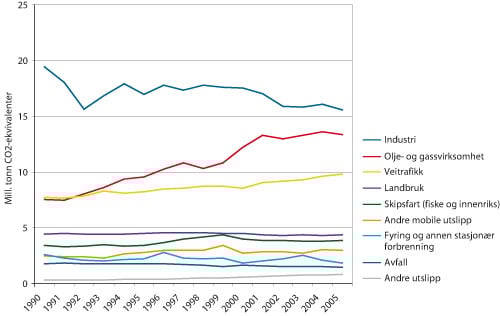 De tre utslippskildene industri, olje- og gassvirksomhet og veitrafikk stod for henholdsvis 29, 25 og 18 prosent, til sammen 72 prosent, av det samlede klimagassutslippet i 2005, jf. fig. 9.2. Det er imidlertid også andre viktige utslippskilder; landbruket var ansvarlig for 8 prosent av utslippene, innenriks sjøfart og fiske for 7 prosent, mens luftfart og andre mobile kilder sto for drøyt 5 prosent. Øvrige utslippskilder som f.eks. boligoppvarming og avfallsdeponering utgjorde til sammen nær 8 prosent av utslippene.