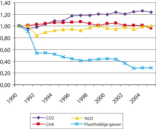 Figur 9.3 Utslipp av klimagasser. 1990 – 2005*. Indeks 1990=1,0.