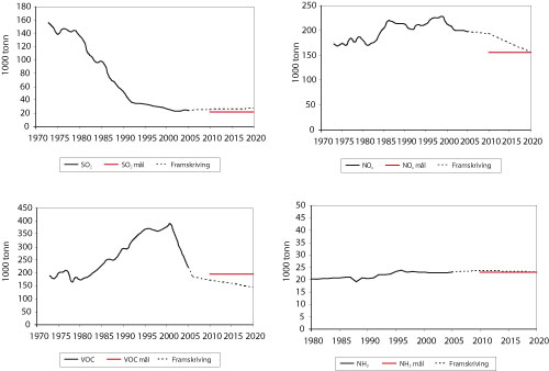 Figur 9.9 viser utviklingen i perioden 1985 – 2005 i norske utslipp av SO2, NOx, VOC (målt som VOC unntatt metan – nmVOC) og NH3 for de kilder som omfattes av Gøteborgprotokollens forpliktelser for disse stoffene. Figuren viser også forventet utslippsnivå fram mot 2020, basert på framskrivninger av økonomisk aktivitet og teknologisk utvikling som ble presentert i Nasjonalbudsjettet for 2007. For NOX er framskrivingen korrigert slik at denne er i samsvar med oppdaterte historiske utslipp av NOX.