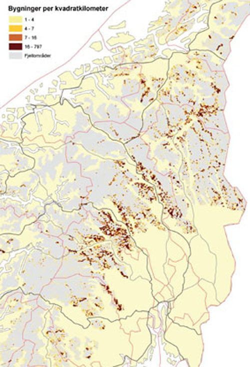 I figur 5.3 er bebyggelsen innenfor fjellområdene på Østlandet vist i form av antall bygninger pr. kvadratkilometer. Selv om fjellområdene her er avgrenset til fjellskogs- og høgfjellsområdene, ser vi at særlig de østre og lavere deler er preget av stor bygningspåvirkning. Bebyggelsen i fjellet er gardsbruk og setrer, reiselivsområder og hytter, boliger og tettsteder. Verneverdiene i fjellområdene er knyttet både til naturen og kulturmiljøene. Det som er felles er at mange av områdene er sårbare i forhold til natur- og kulturverdier, landskap og klima. Fjellområdene krever derfor ekstra omtanke i forhold til inngrep og utvikling. Det er behov for en helhetlig arealpolitikk i fjellbygdene som sikrer kvaliteter og avklarer utviklingsmuligheter.