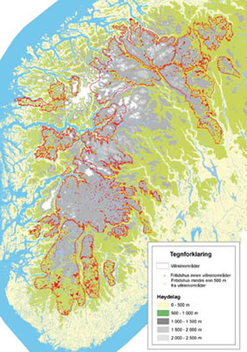 Norge er det eneste landet i Europa som har intakte høyfjellsøkosystemer med bestander av villrein. Fordi en stor andel av den europeiske villreinbestanden befinner seg i Norge, er villreinen å betrakte som en norsk ansvarsart . Ulike arealinngrep, først og fremst veger, jernbaner og kraftutbygging har medvirket til å splitte opp villreinens leveområde. Sikring av villreinens leveområder er viktig for å kunne bevare villreinens sentrale plass i norsk fjellfauna. De største utfordringene i dag er knyttet til utbygging og aktivitet i randsonene til flere av villreinområdene og ferdsel inn i områdene, jf. figur 5.4, som viser hyttebygging i tilknytning til leveområdene for villreinen. Sikring av villreinens leveområder har stått sentralt ved opprettelsen av mange av våre store nasjonalparker og landskapsvernområder, blant annet i Forollhogna, Dovrefjell og Rondane. Slikt vern dekker bare deler av villreinens leveområde, og må utfylles av planer etter plan- og bygningsloven. For flere områder er det utarbeidet fylkesdelplaner som omfatter hele leveområdet, med mål å gi en mest mulig helhetlig arealforvaltning på tvers av kommunegrensene.