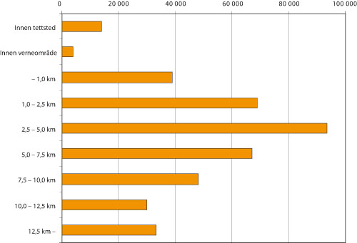 Nær 4 000 fritidshus befinner seg innenfor verneområder som er registrert i nasjonal vernebase, jf. fig. 5.8. Om lag halvparten av alle fritidshus ligger nærmere enn fem km. fra et verneområde. Ca. 3,5 prosent av fritidshusene ligger i et tettsted.