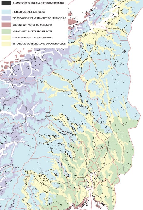 I fig. 5.9 er det lagt inn kilometerruter med fritidsbebyggelse i Øst-Norge. Ca. halvparten av landets hytter ligger innenfor kartutsnittet. De tre største hyttefylkene i landet er Oppland og Buskerud med ca. 40 000 fritidsboliger hver, og Hedmark med ca. 30 000 fritidsboliger. Det er betydelig økning i hyttebyggingen i disse områdene, noe som har sammenheng med relativt kort avstand fra hovedstadsområdet og tilrettelegging av større hytteområder i tilknytning til viktige turistsentra. Andelen nye hytter i fjellet øker i forhold til i strandsonen, der det er et svært begrenset antall hyttetomter i akseptabel avstand fra hovedstadsområdet.