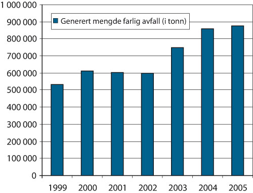 Stadig flere produkter inneholder helse- og miljøfarlige stoffer. Dette gjør at mengden farlig avfall fra slike produkter øker, se fig. 8.12. For å redusere risiko for helse og miljø fra farlig avfall vil Regjeringen redusere mengden farlig avfall som oppstår. Regjeringen foreslo i St. meld. nr 14 (2006 – 2007) Sammen for et giftfritt miljø – forutsetninger for en tryggere fremtid en tilføyelse til det nasjonale resultatmålet for farlig avfall om at genereringen av ulike typer farlig avfall skal reduseres innen 2020 sammenlignet med 2005-nivå.
