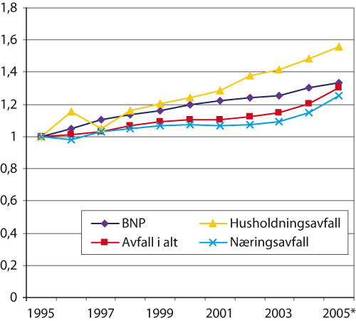 Figur 8.13 Utvikling av BNP og avfallsmengder (indeksert 1995 = 100).