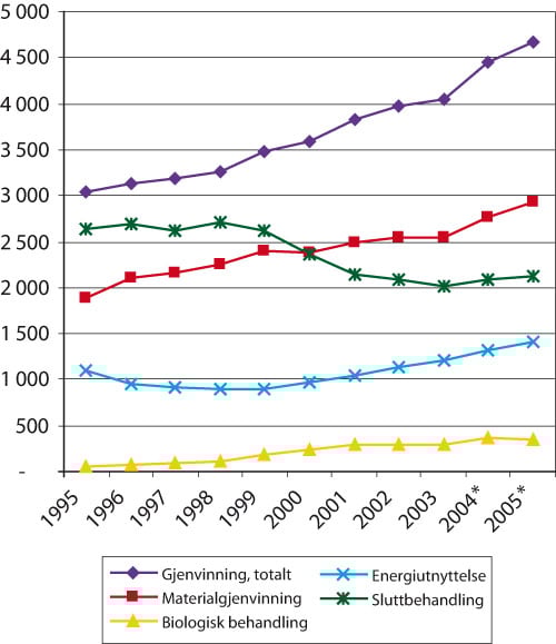 Tall fra Statistisk sentralbyrå for 2005, jf. fig. 8.14, viser at om lag 69 prosent av vanlig avfall blir gjenvunnet. Av avfallet som blir gjenvunnet, går ca. 70 prosent til materialgjenvinning, inkludert kompostering, mens ca. 30 prosent blir energigjenvunnet.