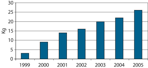 Figur 8.17 Innsamlet mengde EE-avfall pr. person fra 1999–2005.
