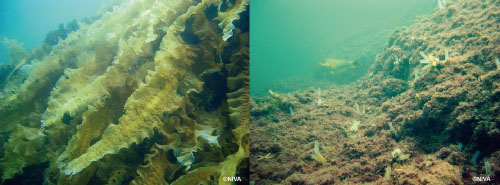 Figur 8.2 Bildene illustrerer hvor dramatiske endringene blir når tareskogen forsvinner. Til venstre er tareskogen frisk, med rikelig tilgang på skjulesteder og mat. Til høyre er tareskogen erstattet av trådformete alger, som ikke gir skjul for yngel og smådyr og der tilgangen på føde blir sterkt redusert.