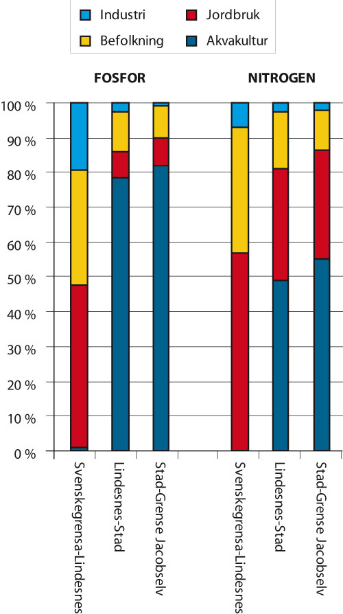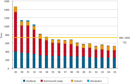 En stor del av innsatsen på overgjødslingsområdet de siste 15 årene har vært rettet mot å oppfylle målet i Nordsjødeklarasjonen om 50 prosent reduksjon av utslippene av fosfor og nitrogen til eutrofipåvirkete deler av Nordsjøen. Som følge av dette var de menneskeskapte tilførslene av fosfor til kyststrekningen svenskegrensen-Lindesnes redusert med 64 prosent i perioden 1985–2005. Tilførslene av nitrogen ble redusert med 42 prosent i samme periode. Tabell 8.1 gir en oversikt over de prosentvise reduksjonene i tilførslene av fosfor og nitrogen til kystområdet svenskegrensen-Lindesnes for de ulike sektorene i forhold til opprinnelige sektormål. Figurene 8.4 og 8.5 viser hvordan utslippene av fosfor og nitrogen på samme strekning fordeler seg på ulike kilder.