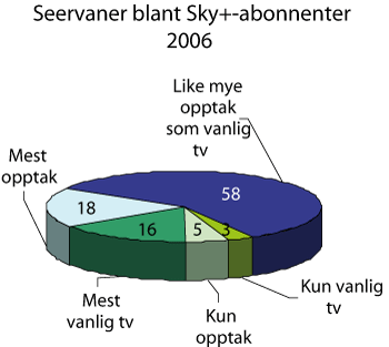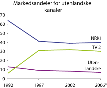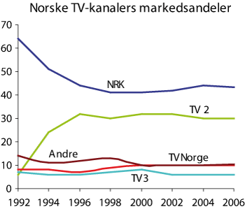 Merk: NRK = NRK1 og NRK2. Fordelingene gjelder sendetid inkludert repriser. For NRK er distriktssendinger inkludert i 2006. NRKs interaktive sendinger uten redaksjonelt innhold er ikke tatt med. For TV 2 er sendinger i regi av TV 2 Interaktiv ikke med. Norskandel for NRK1 i 2006: 63 pst.