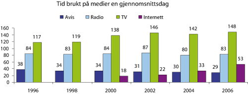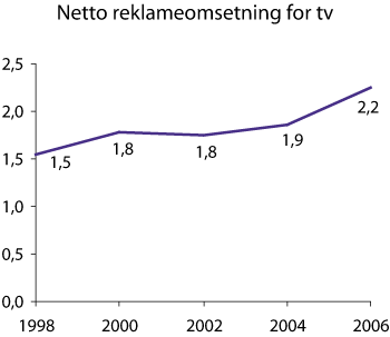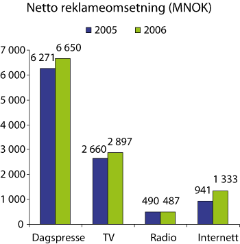 Netto reklameomsetning for fjernsyn hatt en økning fra 2,66 til 2,89 milliarder kroner, dvs. på drøye 9 pst., fra 2005 til 2006. Tilnærmet samme økning ser man for dagspresse, mens reklameomsetningen for radio går noe tilbake. Den mest markante økningen i reklameomsetning står Internett for. Økningen var stor fra 2005 til 2006, og ifølge tall fra Nettforum og INMAs annonsestatistikk for første kvartal i 2007 har det vært en økning i merkevareannonseringen på 33 pst. sammenlignet med året før. Internetts andel av den totale reklameomsetningen er imidlertid fortsatt relativt beskjeden sammenlignet med fjernsyn og dagspresse. Dersom den beskrevne tendens til at publikum bruker mindre tid på fjernsynsmediet viser seg å vedvare, er det grunn til å tro at fjernsynsmediets andel av det totale reklamemarkedet vil falle.
