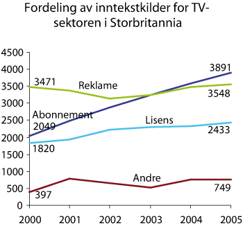 Abonnementsinntekter fikk allerede i 2003 større betydning enn reklameinntekter, men også reklameinntektene har økt i de senere år. Tallene viser derfor at betal-tv-inntektene ikke nødvendigvis erstatter reklameinntekter. For Storbritannias del er det mer dekkende å si at veksten i betal-tv-inntekter har bidratt til å styrke det totale finansieringsgrunnlaget for fjernsynssektoren.