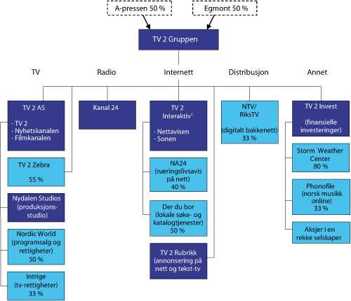 TV 2-gruppen har i de senere år utviklet seg fra primært å være en fjernsynskanal til et mediehus med eierinteresser bl.a. i radio, tv, nettavis, samt i en fjernsynsdistributør.