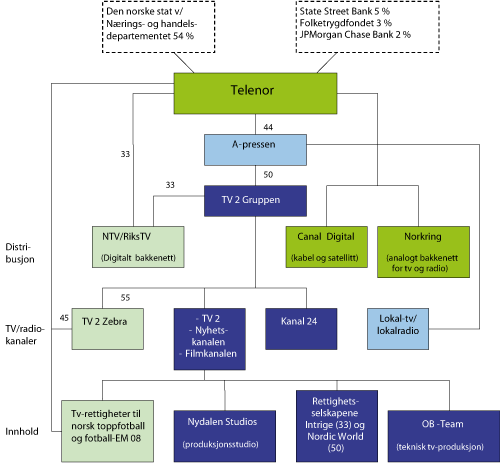 Telenor Broadcast Holding AS eier 44,8 pst. av A-pressen, som igjen eier 50 pst. av TV2-gruppen. Telenor har følgelig ca. 23 pst. indirekte eierinteresse i TV 2-gruppen.