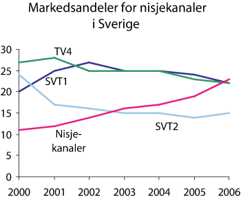 Mange norske tv-seere har i lang tid hatt tilgang på internasjonale nisjekanaler som for eksempel natur- og vitenskapskanalene Discovery, National Geographic og Animal Planet, og barnekanalene Disney Channel og Nickelodeon. Framvekst av nisjekanaler er en internasjonal trend. I Norge har vi foreløpig sett lite av dette. Nisjekanaler har gradvis vunnet terreng hos publikum i Sverige. Selv om det svenske kringkastingsmarkedet er større enn det norske, kan situasjon her kaste lys over hvordan utviklingen vil kunne gå også i Norge. I Sverige har stadig nye nisjekanaler blitt etablert og deres samlede andel av markedet øker.