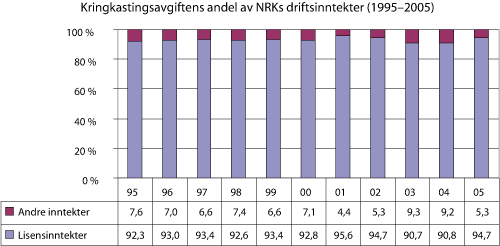 Figur 6.1 Kringkastingsavgiftens andel av NRKs driftinntekter(1995–2005)