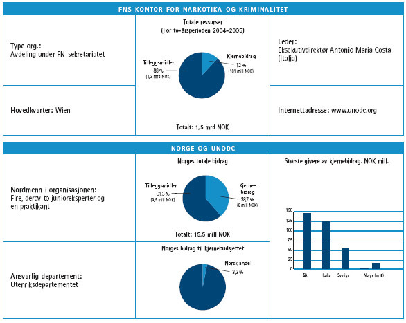 • Bidra sammen med andre givere til at UNODC har sikker og forutsigbar finansiering, og arbeide for å bedre byrdefordelingen mellom giverlandene for å øke andelen uøremerkede midler i forhold til øremerkede i UNODCs budsjett Norge vil styrke dialogen om giverharmonisering og FN-reform både på hovedkvartersnivå og i samarbeidsland, basert på forslagene i likesinnetpapiret om FN-reform (Utstein + papiret) fra 2004. Blant de prioriterte områdene kan nevnes: