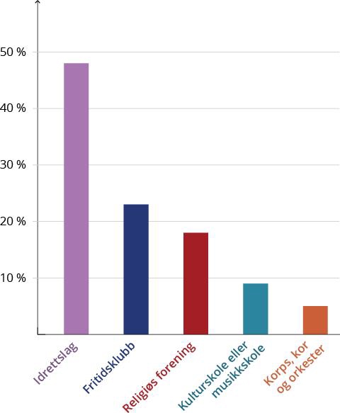 De fleste barn og unge er innom fritidsaktiviteter i oppveksten, rundt halvparten av norske ungdommer sier de er med i en fritidsaktivitet nå, mens 14 prosent sier at de aldri har vært med i organiserte fritidsaktiviteter. I Ungdataundersøkelsen for elever på ungdomstrinnet og i videregående skole i 2022 svarer 48 prosent at de var med i idrettslag, 23 prosent i fritidsklubb, 18 prosent i religiøs forening, 9 prosent i kulturskole eller musikkskole og 5 prosent i korps, kor og orkester. Undersøkelsene viser at det er frafall fra organiserte fritidsaktiviteter i tenårene19.