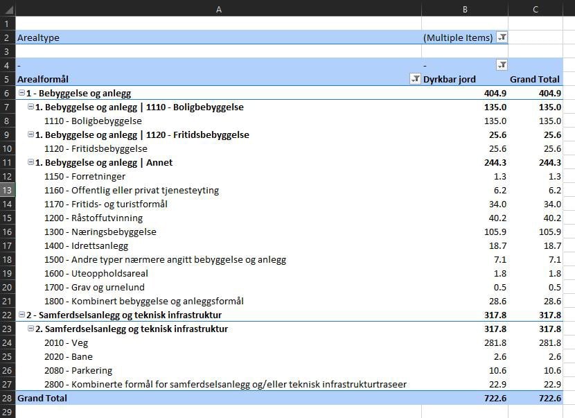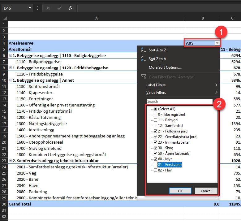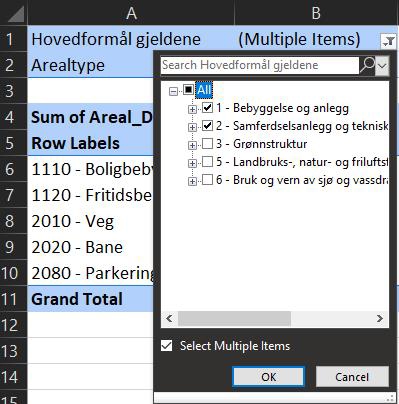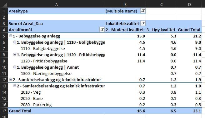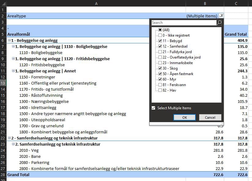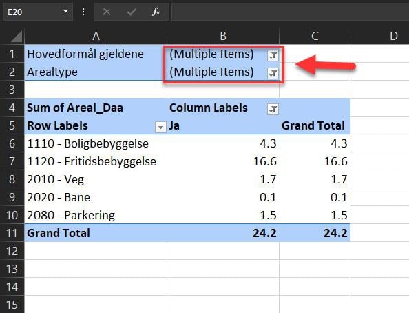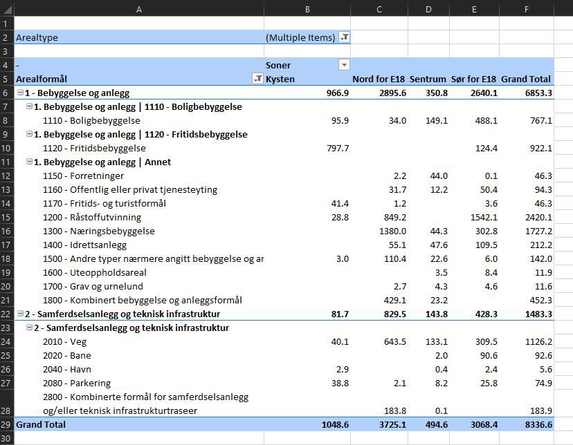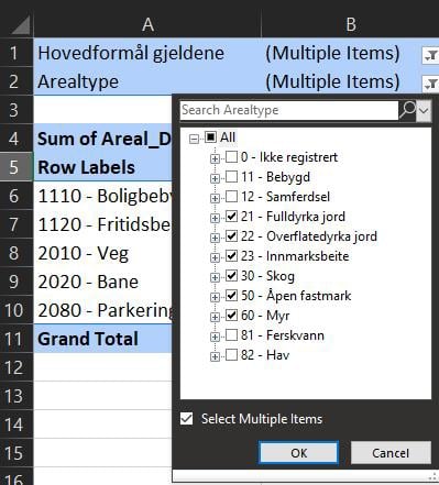Figur 52: Filtrere på arealtype i pivottabell