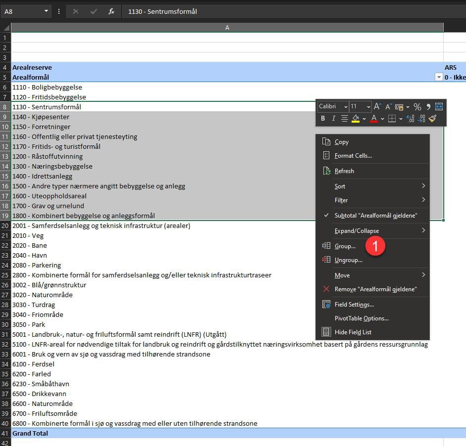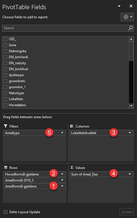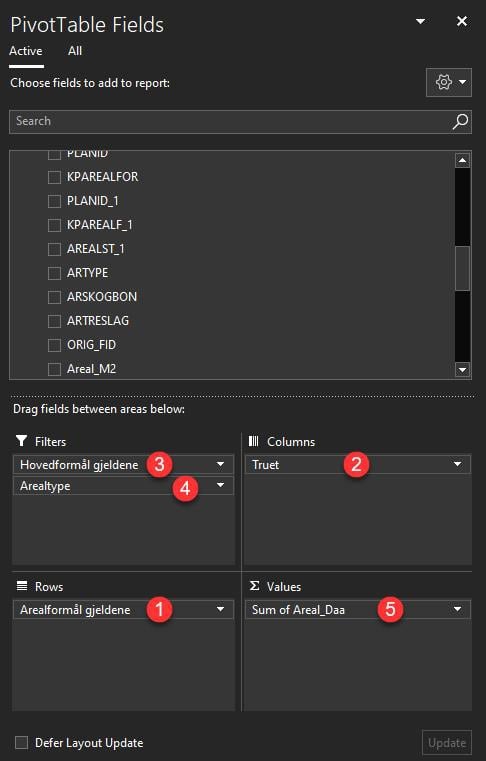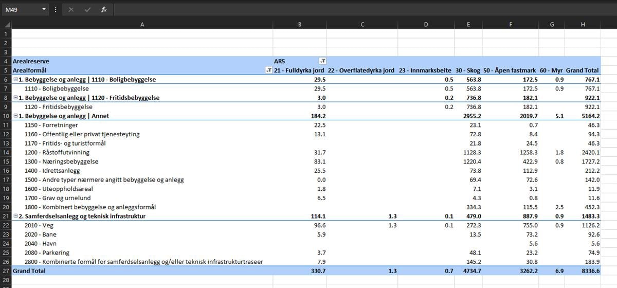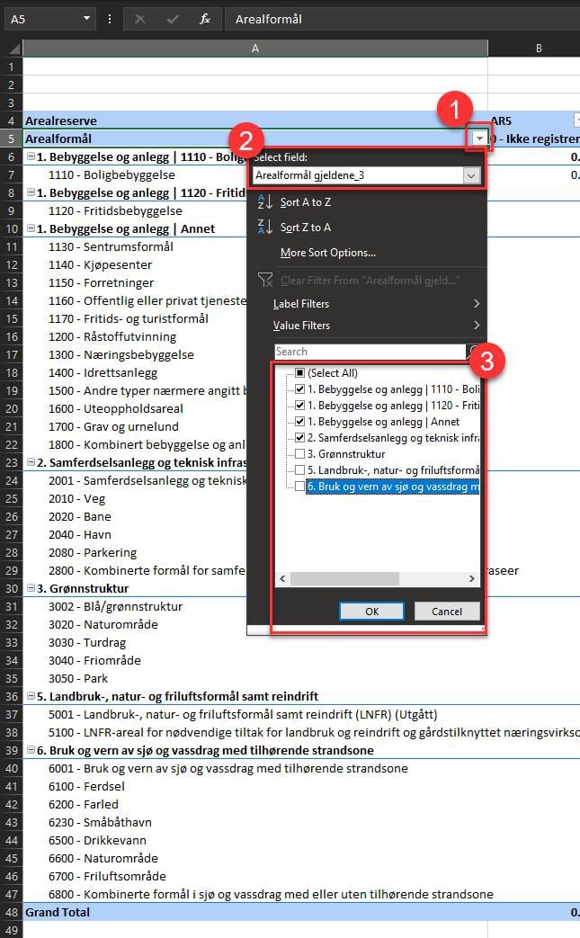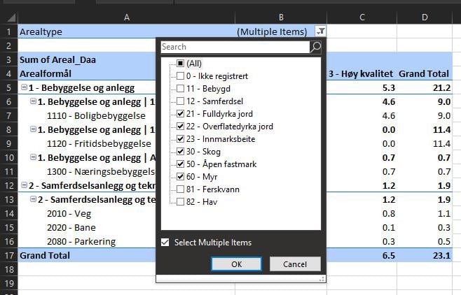 Figur 52: Filtrere på arealtype i pivottabell