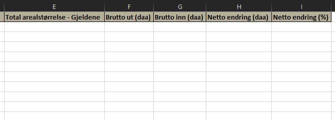 Figur 55: Legg til egne celler for total arealstørrelse, brutto inn og ut, netto endring, og netto endring %