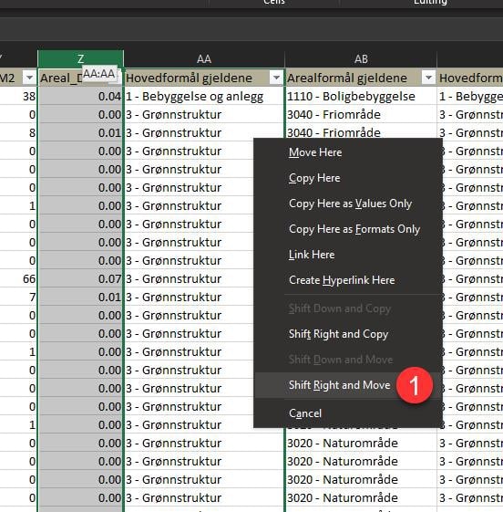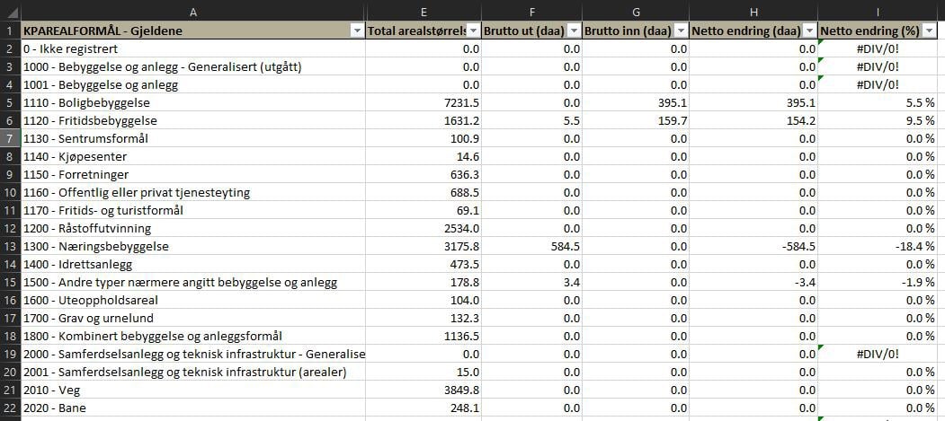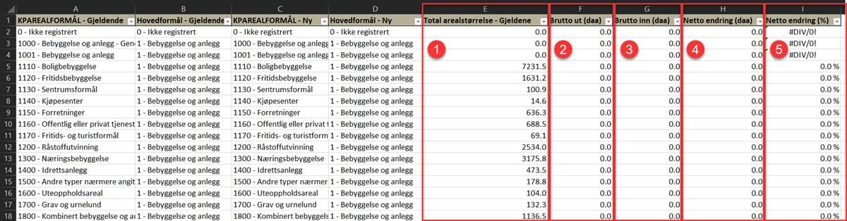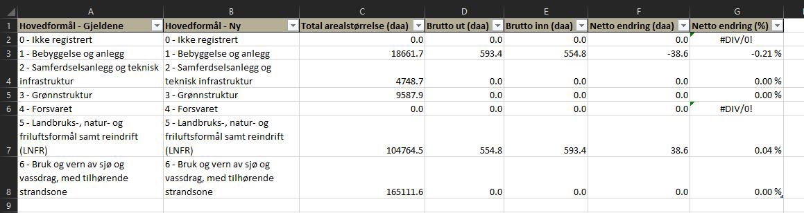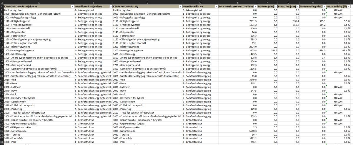 Figur 60: Eksempel på regneark for arealformålsendringer etter at overflødige kolonner er skjult