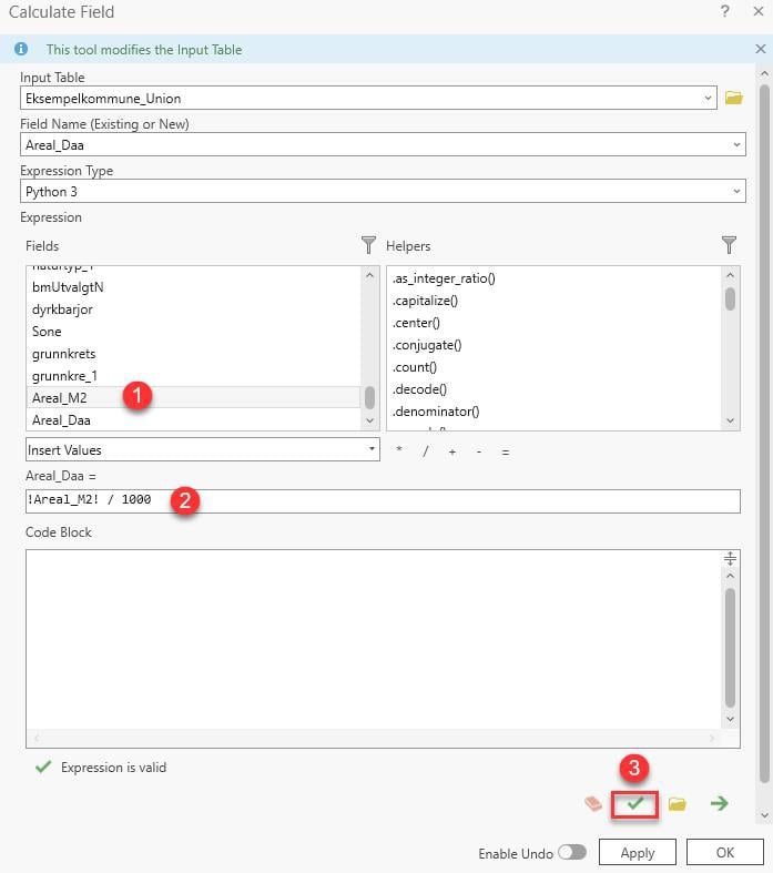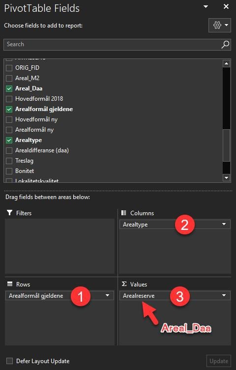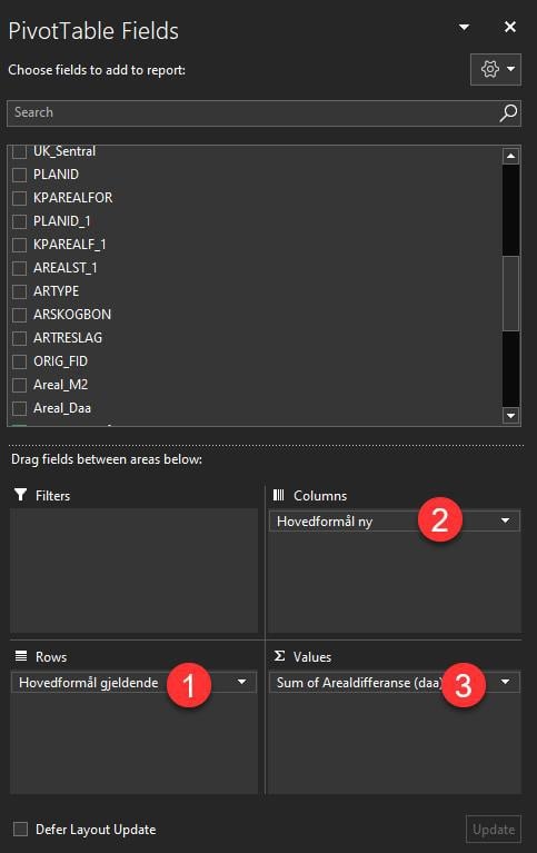 Legg inn hovedformål gjeldende som rader (1), hovedformål ny som kolonner (2), og arealdifferanse som verdier (3).