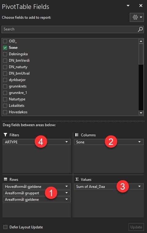 Lag en pivottabell fra rådata-fanen først. Legg inn arealformål og hovedformål som rader (1), og sonedata som kolonner (2). Alternativt kan også sonedata komme inn som rader som kan grupperes i etterkant. Legg inn Areal_Daa som verdier (3) og arealtype som filter (4).