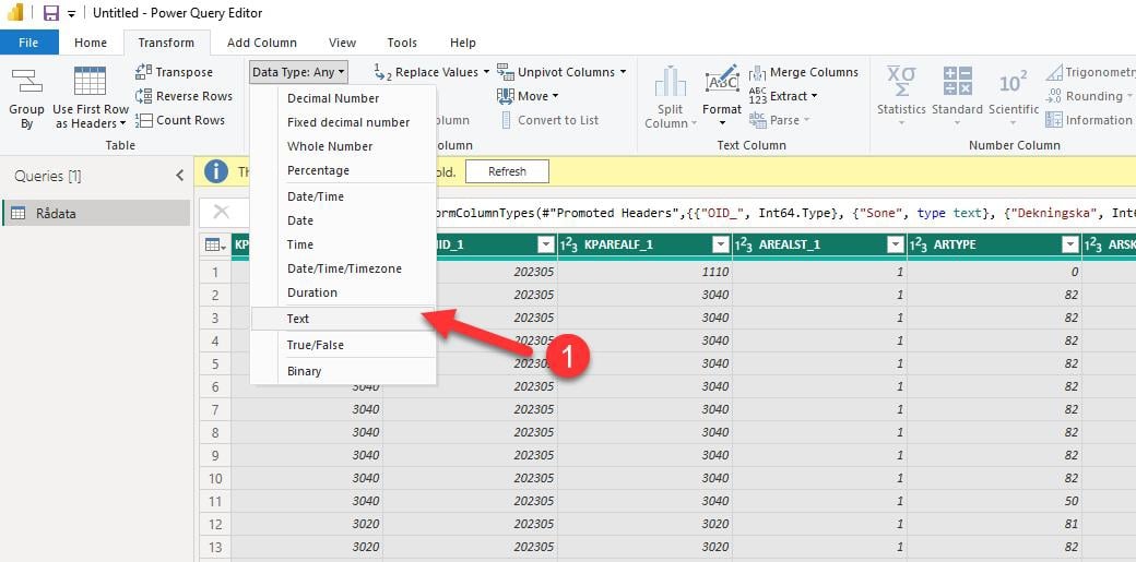 Transformer datasettet Rådata (1) og velg transformer (2).