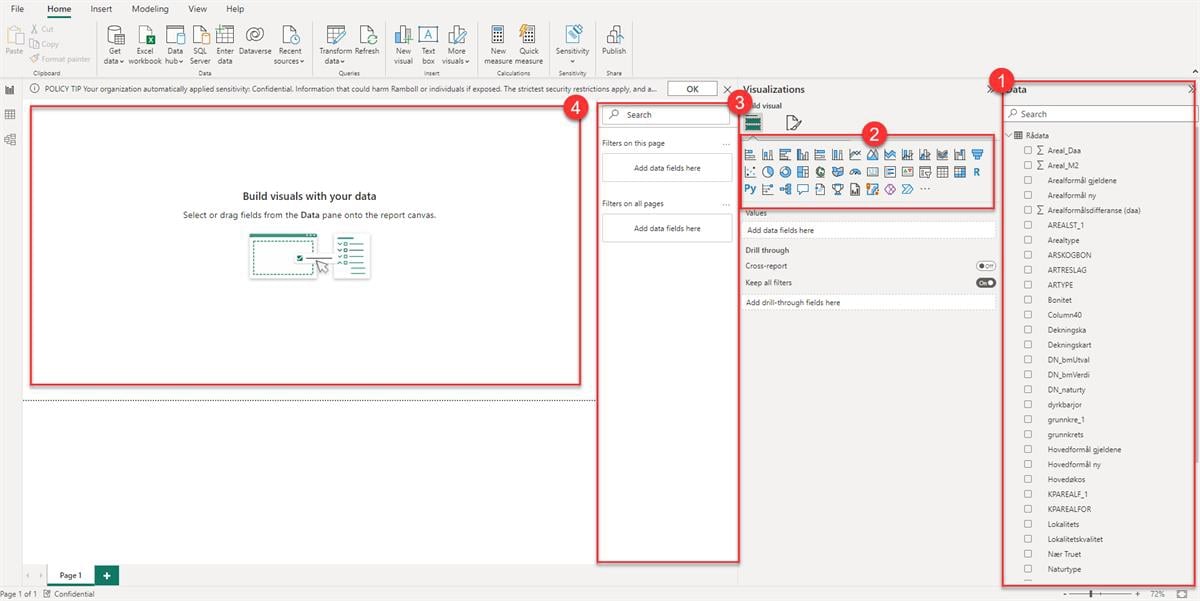 Under datakolonnen (1) kan du velge hvilke data som skal analyseres. Under visualiseringer (2) kan du velge hvilke type visualiseringer og diagrammer du ønsker å presenter. Under filtre (3) kan du legge inn filtre for selve diagrammet, sidevisningen, eller hele datasettet. På sidevisningen (4) legger du inn datavisualiseringen og grafisk ordner diagrammer.