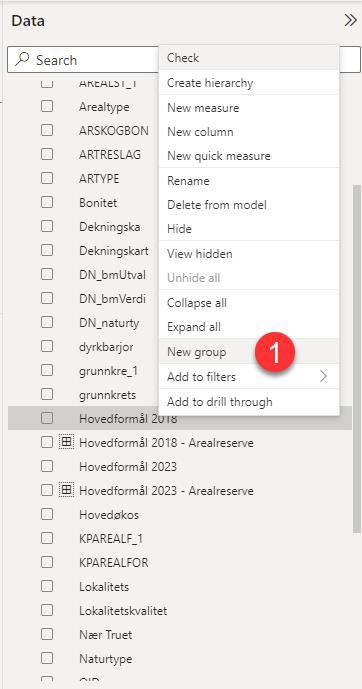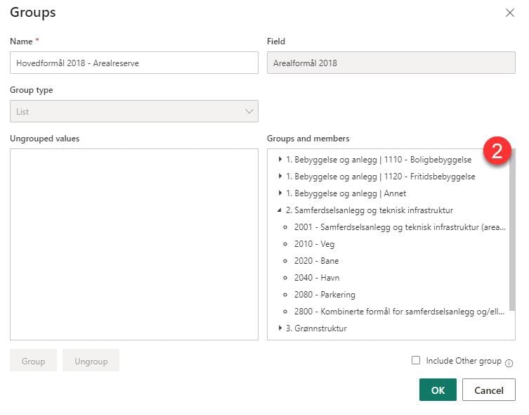 I datakolonnen kan gruppere data (1). Eksempelvis kan du gruppere hovedformål slik at du enkelt kan lage en gruppe for å vise arealreserve.