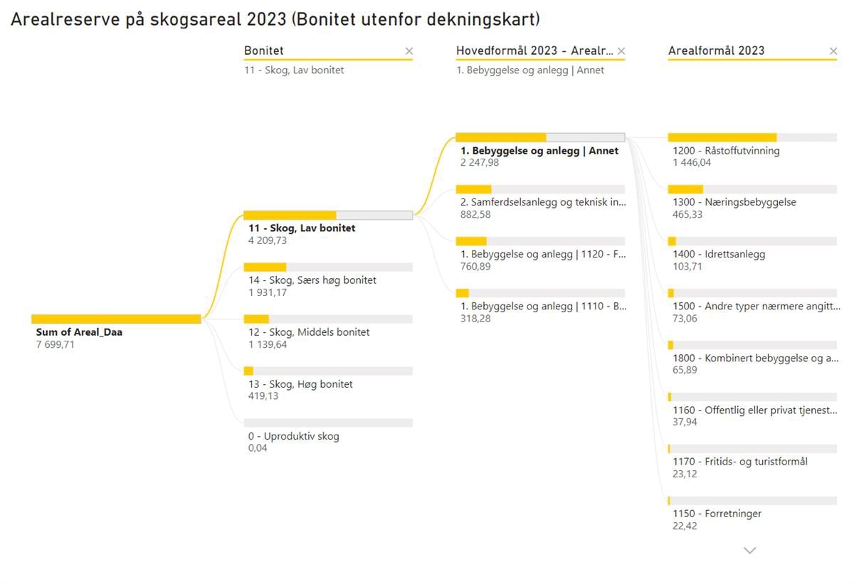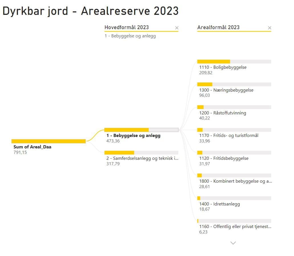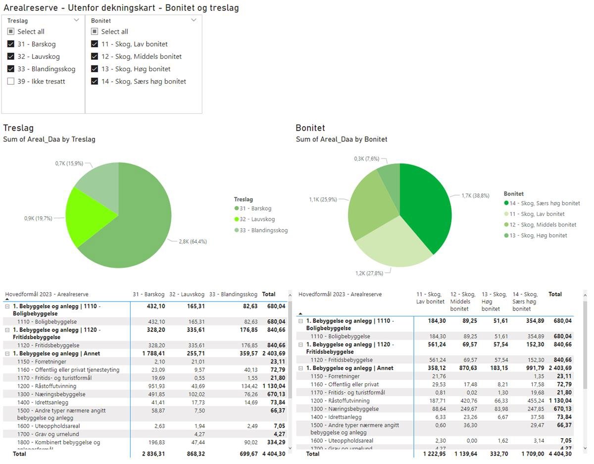 Til slutt vises hvordan rådata fra regnearkprogrammet kan bli brukt i et analyseprogram (her vist i Power BI). I slike programvarer kan data bli analysert noe enklere og mer dynamisk enn i regnearkprogrammer. Eksempelvis har også programvaren Power BI blitt brukt arealregnskap for Agder fylkeskommune for å gi publikum enkel tilgang til datagrunnlaget, slik at de kan analysere data selv.