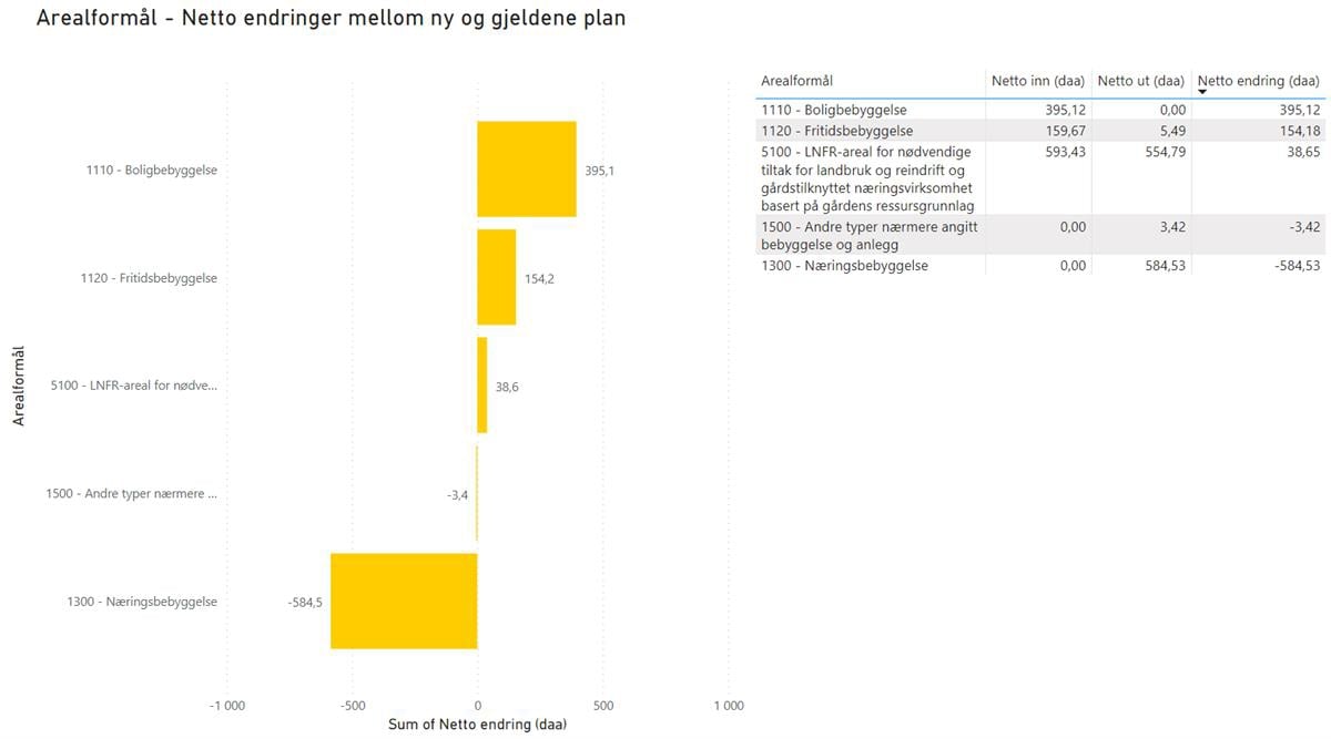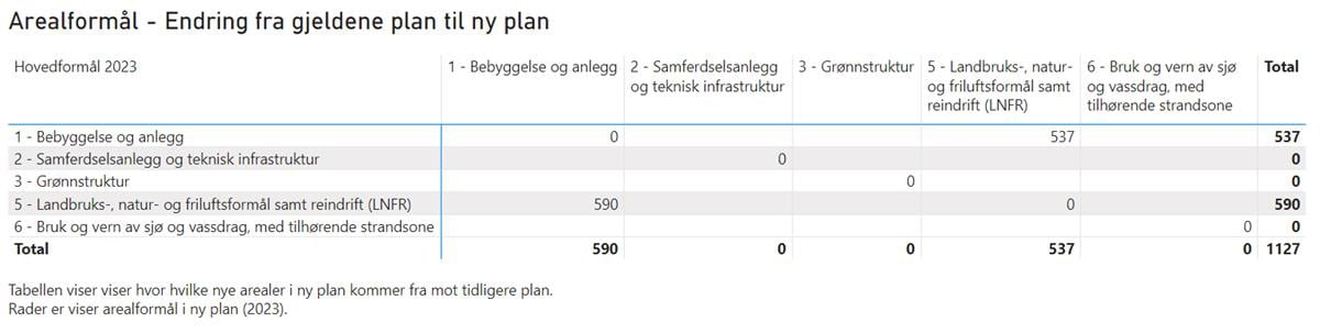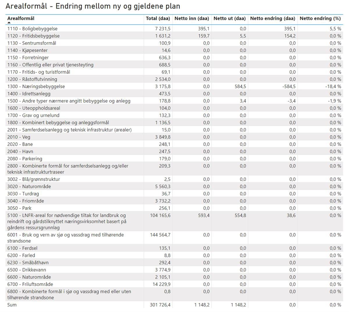 Tabellen viser totalt areal av gjeldene arealformål, hvilke arealstørrelser som tas ut, hvilke arealstørrelser som tas inn, netto endring, og netto endring i prosenstørrelser.