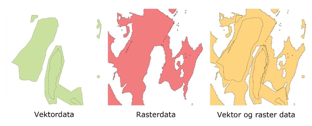 Figur 4: Eksempler på vektor- og rasterdata og kombinasjon av disse.