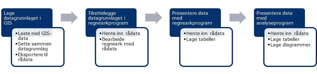 Arbeidet med å lage datagrunnlag, tabeller og diagrammer til arealregnskapet for kommuneplanens arealdel følger denne prosessen: