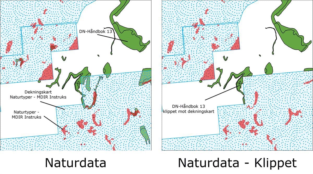 For datasettet Naturtyper – Miljødirektoratets instruks finnes det dekningskart som viser hvor det har blitt gjort naturundersøkelser. Utenfor dekningsområdet for Naturtyper – Miljødirektoratets instruks kan det være aktuelt å bruke det eldre datasettet DN-håndbok 13. Hvordan de to datasettene kan kombineres er beskrevet i 2.4.