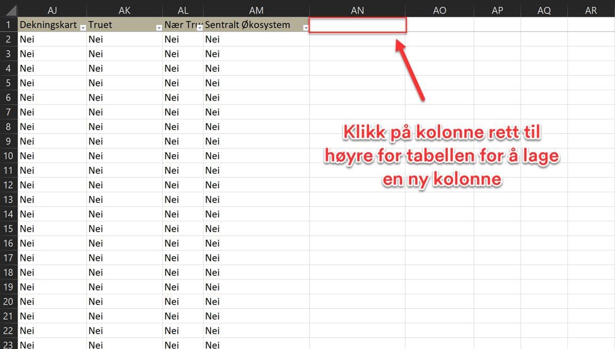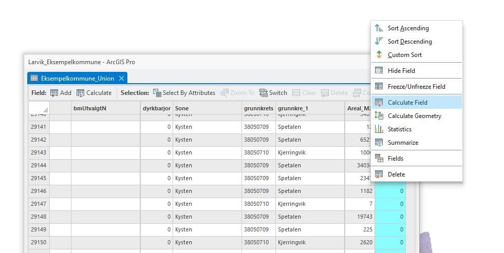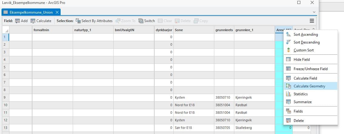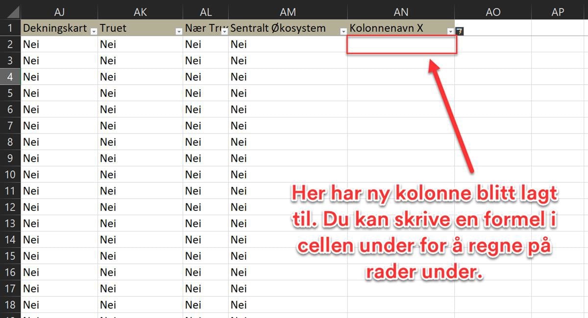 Figur 58: Fem nye kolonner legges til i tabellen for å vise arealformålsendringer