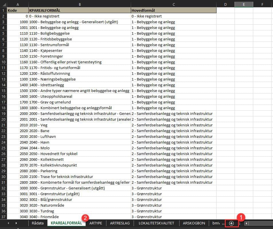 Lag en ny fane på regnearket som skal hete Arealformålsendringer. Her kopierer du over en komplett formålskodeliste fra fanen KPAREALFORMÅL. Legg kolonnene inn slik at du får fire kolonner: