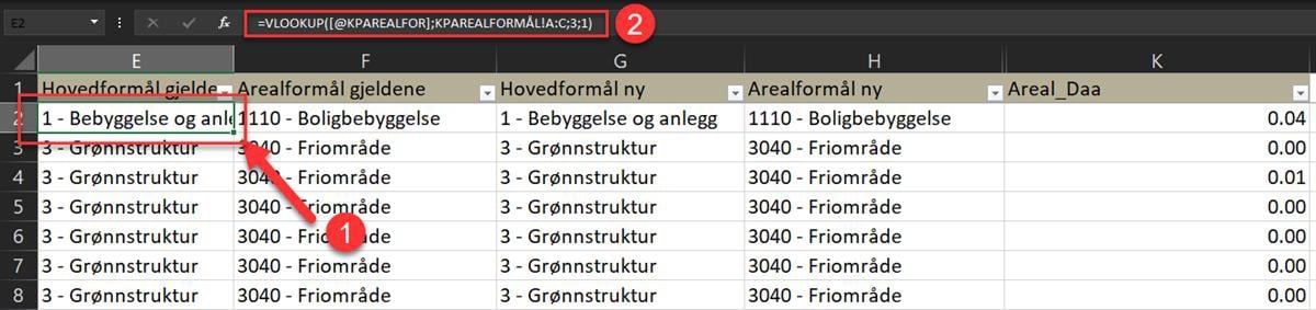 Ved å skjule kolonner for hovedformål ny og gjeldende, og arealformål ny, kan tabellen forenkles til videre bruk:
